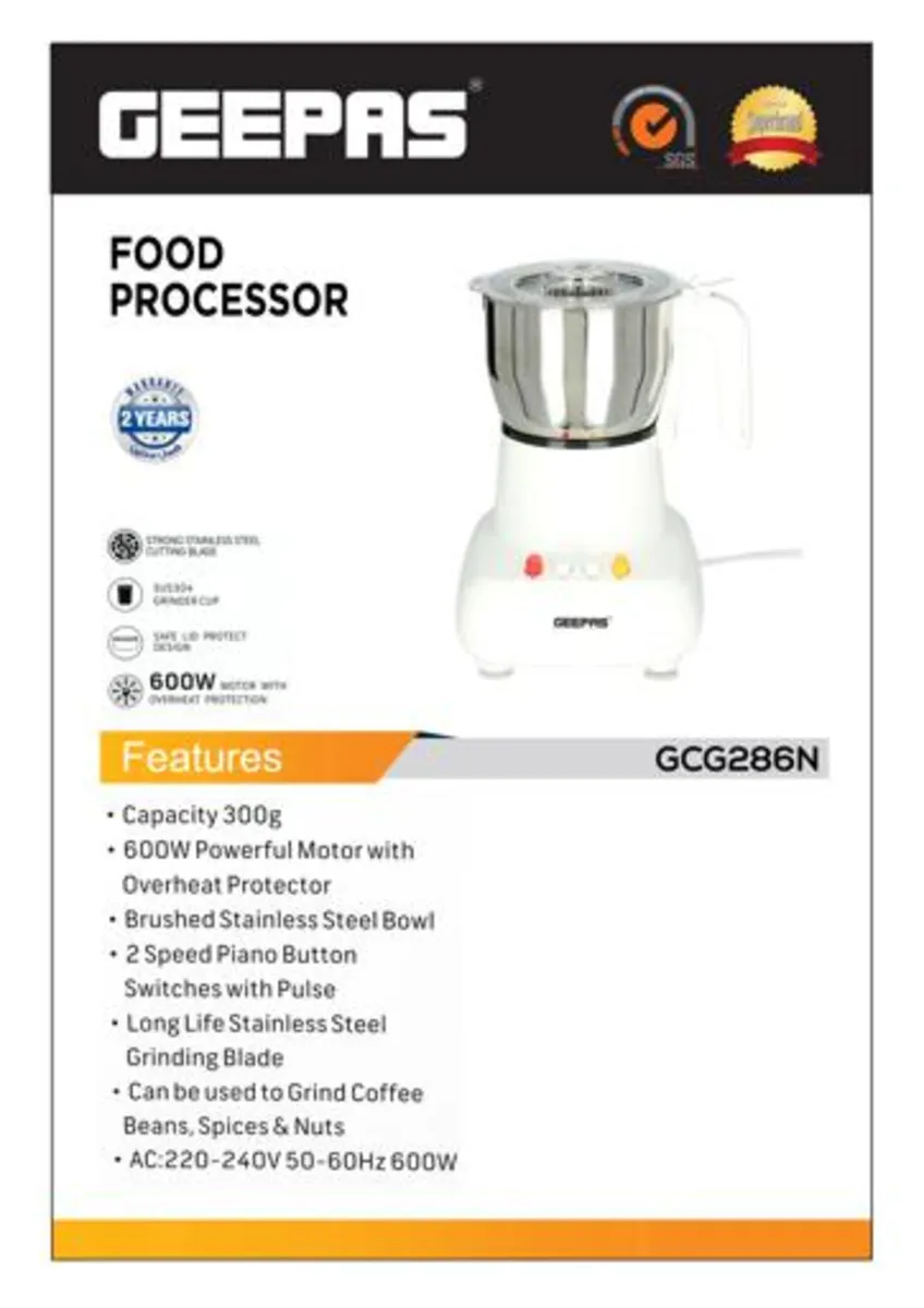 آسیاب برقی جیپاس مدل GCG286 با داشتن ظرفی از جنس فولاد ضدزنگ توان آسیاب کردن حجم بالای موادغذایی در یک مرحله را دارد. آسیاب قهوه جی پاس با داشتن تیغه هایی باکیفیت از جنس فولاد ضدزنگ توان دستگاه برای پوره کردن موادغذایی را دوچندان میکند. دستگاه فوق دارای درپوشی از جنس پلاستیک شفاف می باشد. آسیاب جیپاس نه تنها برای قهوه برای برای انواع مواد دیگر از جمله ادویه جات ،مغزی جات، داروهای محلی و … مورد استفاده قرار می گیرد.