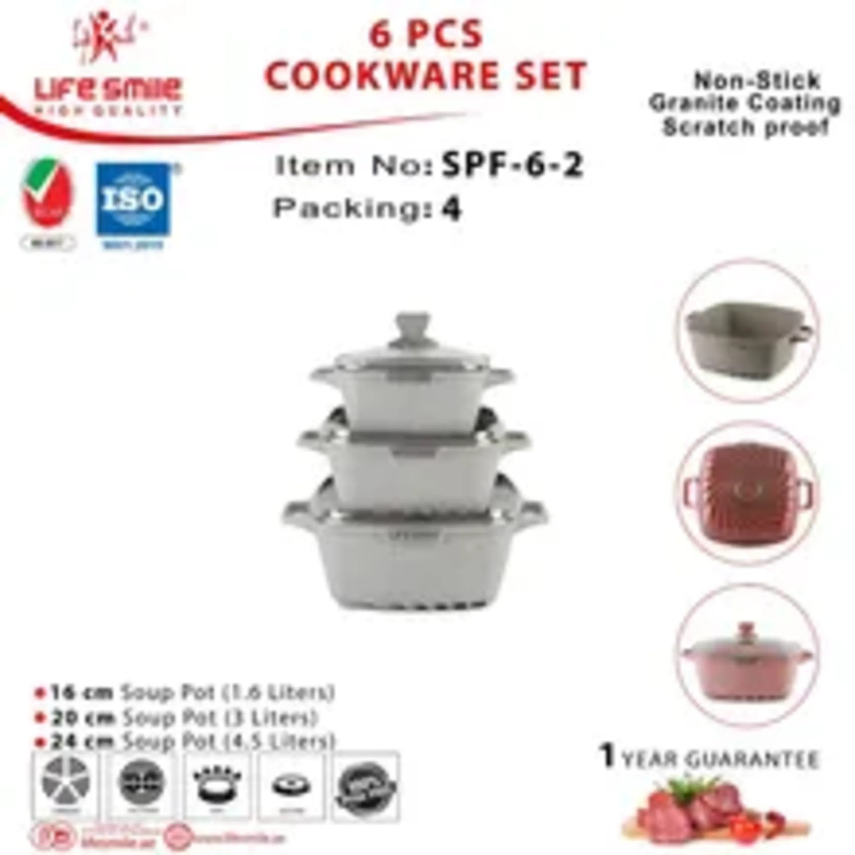 .سرویس قابلمه 6 پارچه لایف اسمایل مدل SPF-6 یکی از محصولات برند محبوب لایف اسمایل می باشد که برای هر آشپزخانه ای ضروری است. این سرویس 6 پارچه شامل 3 قابلمه در سایز های 20، 24، 28 سانتی متر است. جنس این سرویس کاربردی از آلومینیوم ریخته گری بوده و به همین دلیل مقاومت حرارتی بالایی داشته و تا دمای 200-240 سانتی گراد را تحمل می کند. درب های شیشه ای آن نشکن، مقاوم در برابر حرارت و دارای دریچه خروج بخار است که مانع سر رفتن غذاها می شود. دستگیره های این سرویس به صورت یکپارچه با قابلمه بوده و از جنس بدنه آن است و از استحکام بالایی برخوردار می باشد.
