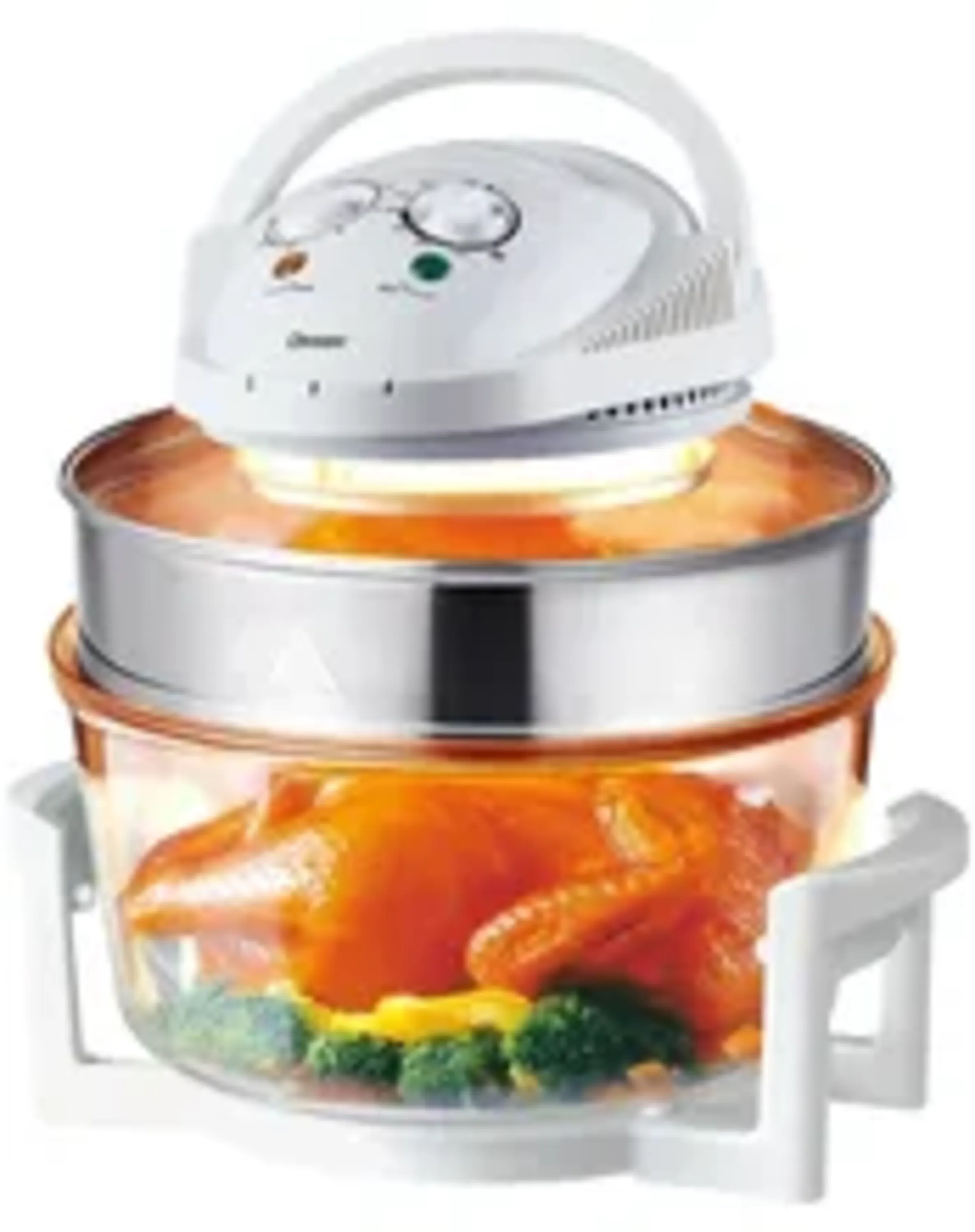 هواپز و فر نوری توربو دسینی، دستگاهی سالم همراه با قیمت مقرون به صرفه است که به لامپ هالوژنی مجهز شده و با تولید امواج نوری و گردش هوای گرم، پخت یکنواخت قسمت های مختلف غذا را در کمترین زمان ممکن به ارمغان می آورد و به جرات می توان گفت، بهترین و سالم ترین دستگاه، جهت طبخ غذا بدون آب و یا روغن محسوب می شود که توانسته طرفداران بسیاری را به سوی خود جذب نماید. عدم نیاز به روغن و یا آب، از ویژگی های برجسته این محصول به شمار می آید و برای افرادی که به دنبال رژیم های کم کالری و یا گیاه خواری هستند، بسیار کاربردی می باشد. گفتنی است، این دستگاه علاوه بر طبخ غذای رژیمی، از سرعت پخت بیشتری نسبت به دیگر دستگاه های مشابه موجود در بازار برخوردار است . بوسیله این فرنوری توربو دسینی می توان بدون هیچ محدودیتی انواع خوراکی ها را با تنظیم زمان، براساس نوع مواد غذایی طبخ نمود. این دستگاه با بهره گیری از موتوری با توان 1200 وات، برای مصارف خانگی بسیار ایده آل می باشد. فر هالوژنی Dessini Turbo دارای ظرف شیشه ای شفاف با ظرفیت 12 لیتر است و برای پخت کیک، بخارپز کردن، برشته و بریانی کردن، سرخ کردن بدون روغن، پخت پیتزا، تست نان، خشک کردن میوه، پخت کیک، یخ زدایی مواد منجمد و ... بسیار کاربردی خواهد بود. این هواپز دسینی مدل توربو به گونه ای است که می توان به صورت همزمان از دو طبقه برای طبخ غذاهای متفاوت استفاده کرد. این محصول به صورتی طراحی شده تا روغن و چربی موجود در مواد غذایی به ته ظرف ریخته شود و در نتیجه، با عدم جذب روغن به مواد در حال پخت، بتوان غذای سالم تری را تهیه نمود. همچنین این مدل به تایمر قابل تنظیم 60 دقیقه ای نیز مجهز شده و با امکان تنظیم درجه حرارت متناسب با نوع مواد غذایی، آشپزی را آسان تر کرده است.