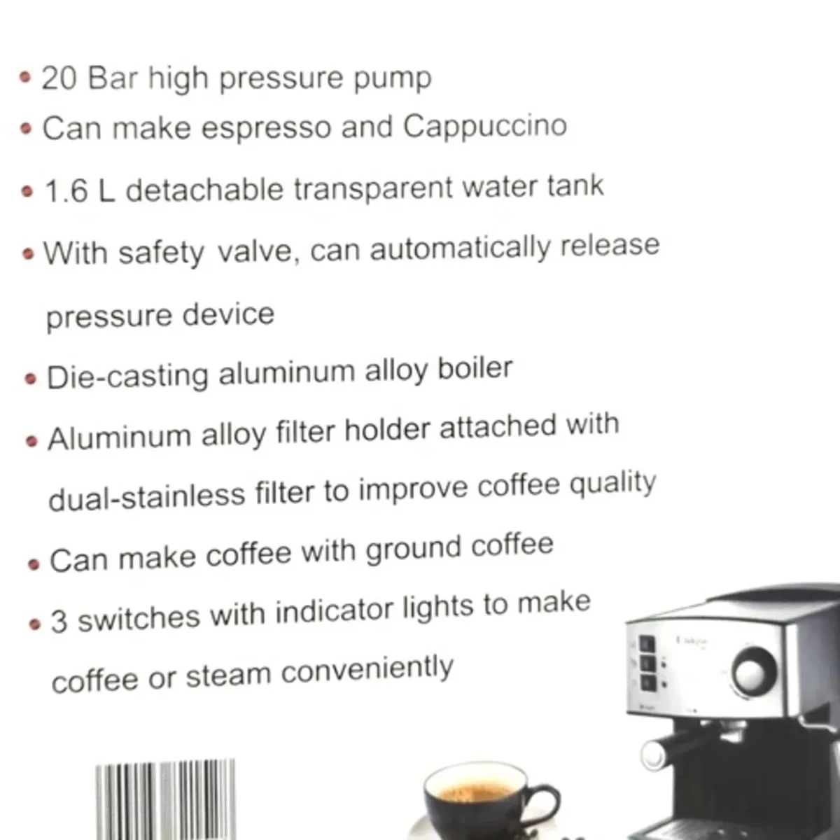 پمپ فشار قوی 20 بار 2 کوپ عقربه دار گرم کن می تواند اسپرسو و کاپوچینو و لاته درست کند 1.6 لیتری مخزن آب شفاف جدا شونده با دریچه ایمنی، می تواند به طور خودکار دستگاه فشار را آزاد کند دیگ آلیاژ آلومینیوم ریخته گری دایکاست نگهدارنده فیلتر آلیاژ آلومینیوم با فیلتر دوگانه ضد زنگ برای بهبود کیفیت قهوه متصل شده است می تواند با قهوه آسیاب شده قهوه درست کنید 3 سوئیچ با چراغ های نشانگر برای تهیه راحت قهوه یا بخار