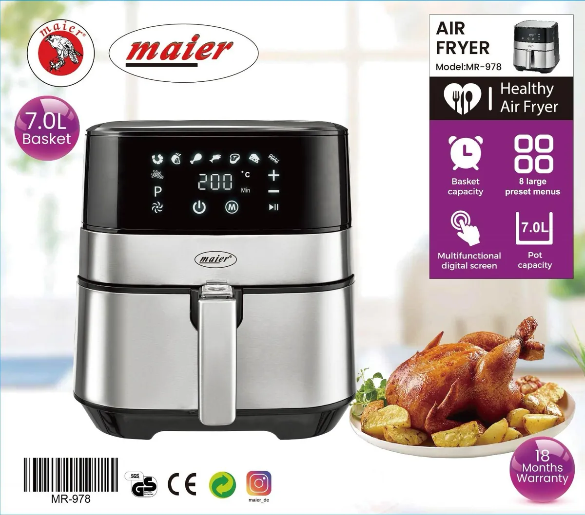سرخکنها به سه دسته برقی و گازی و ایرفرایر تقسیم میشوند. سرخکن مایر مدل MR-978 از نوع سرخکنهای برقی است. این دستگاه برقی عملیات سرخ کردن مواد غذایی را سرعت بخشیده و کار سرخ کردن را بهتر از هر وسیله دیگری انجام میدهد. طراحی ساختاری ساده داشته و اجزا و قطعات تشکیل دهنده آن سادهای دارد که به راحتی قابل استفاده و باز و بسته کردن هستند. به طور کلی این دستگاه مجموعهای از یک محفظه برای گرم کردن یا داغ کردن سینی و یک محفظه از روغن تشکیل می شود. این محصول مجهز به المنتی با توان بسیار زیاد و ظرفیت و گنجایش مناسب و نوع قطعاتی که در آن به کار گرفته شده، متمایز از سایر محصولات مشابه است.