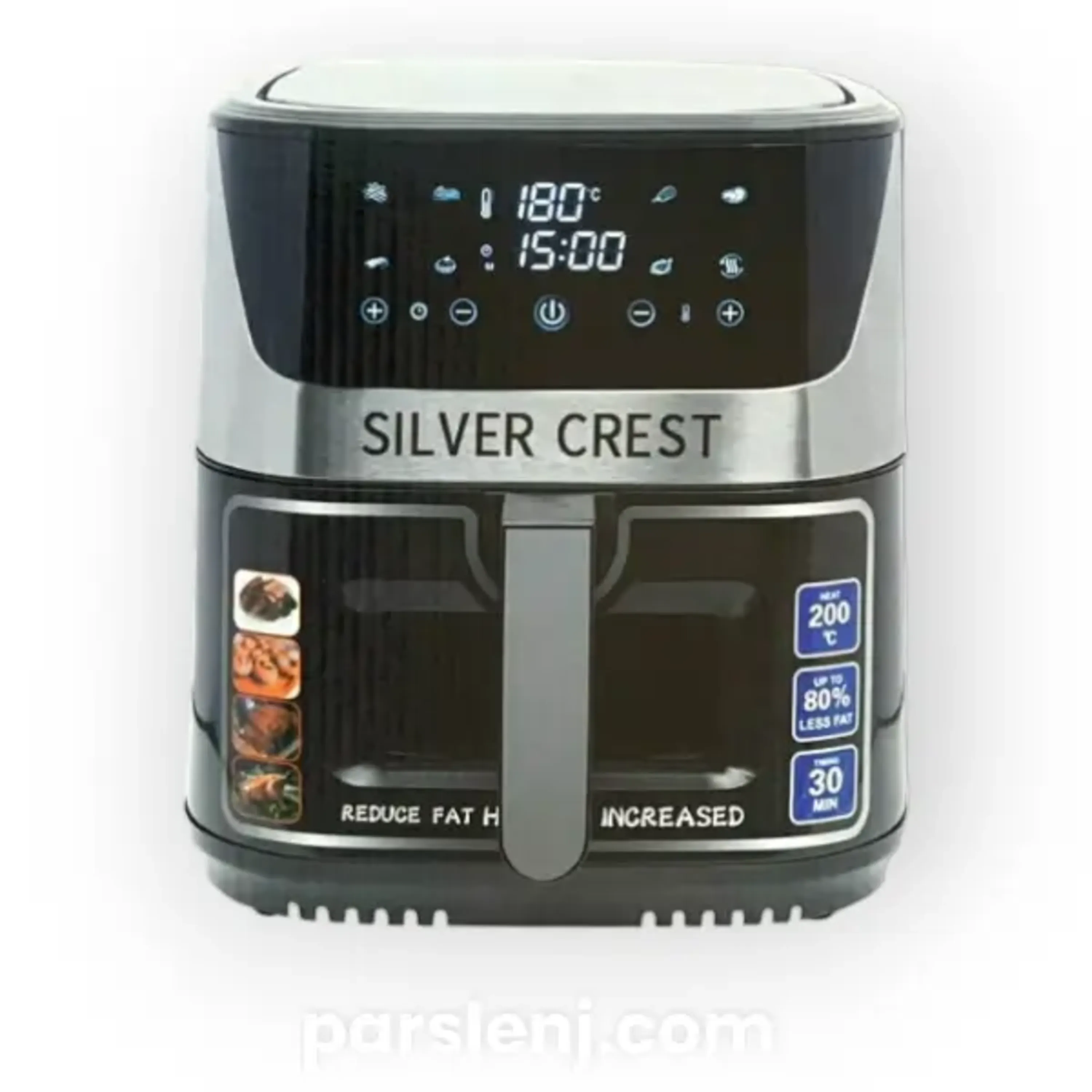 👈 سرخکن سیلورکرست در رنگ مشکی و استیل در بازار عرضه شده است. در قسمت جلویی دستگاه یک صفحه نمایش رنگی با قابلیت لمسی تعبیه شده است که کنترل و فرماندهی کل دستگاه از این قسمت صورت میگیرد. در این صفحه نمایش حالت ((MANUAL)) نیز دیده شده تا شما بتوانید دما و زمان دلخواه خود را بصورت دستی وارد کنید. .