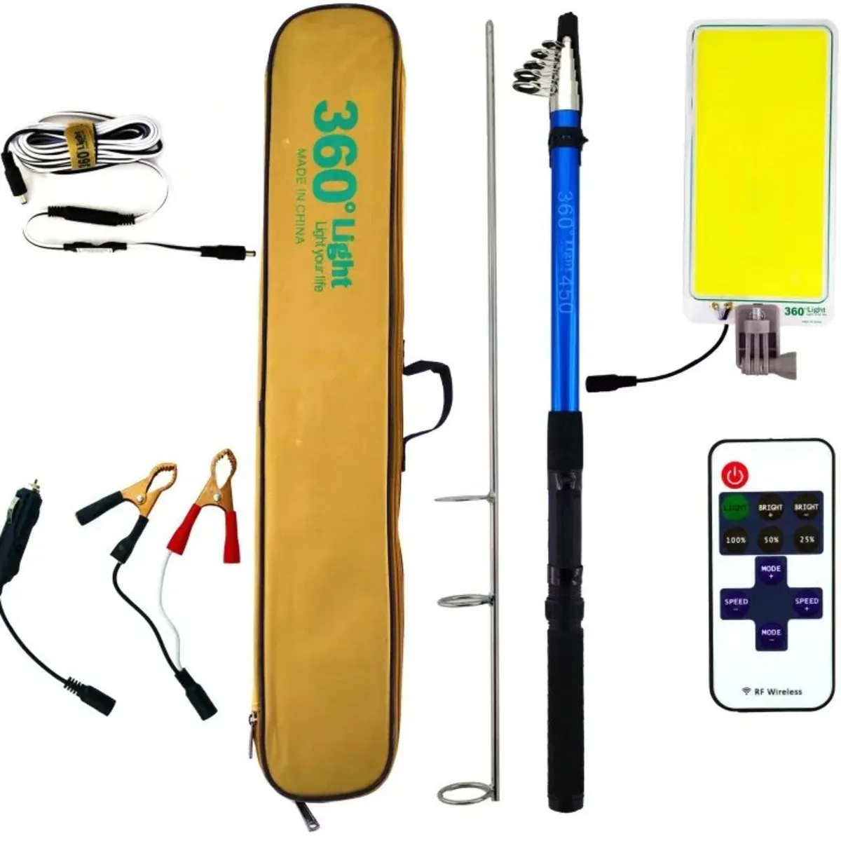 چراغ روشنایی کمپینگ 360 درجه لایت تلسکوپی، که به آن چراغ لنسری یا ماهیگیری (Fishing Light) نیز گفته می شود، وسیله ای مناسب جهت کمپینگ، مسافرت، لامپ تعمیر خودرو، روشنایی فضای باز و محیط های تاریک می باشد. چراغ کمپینگ با ریموت کنترلی که دارد یکی از محصولات پرطرفدار و پرکاربرد برای کسانی که قصد سفر و کمپینگ دارند به حساب می رود. پایه این چراغ که یک لنسر سبک است بصورت تلسکوپی باز می شود و تا ارتفاع 5 متر قابل افزایش و از استحکام قابل قبولی برخوردار است. یکی از مزایای این چراغ، پایه مستحکم فلزی قابل تنظیم در قسمت زیر آن می باشد که قادر است در زمین فرو رود و لنسر درون آن قرار گیرد تا چراغ به حالت ایستاده استفاده شود. کابل بلند این کمپینگ لایت به طور مستقیم و با دو گیره اتصال مخصوص، به باتری خودرو متصل می گردد. چراغ کمپینگ تلسکوپی با کنترل از راه دور، به شما این امکان را میدهد تا در مواقع ضروری و یا در کمپ ها و همچنین پیک نیک های خود، منبع نوری فوق العاده ای داشته باشید و با قابلیت افزایش ارتفاع آن می توانید نور را از بالا و در ارتفاع قرار دهید تا بیشترین فضای ممکن را روشن نمایید. با داشتن کنترل از راه دور، برای کم کردن و یا خاموش و روشن نمودن دستگاه نیازی به نزدیک شدن به اتصالات و یا دستگاه نداشته و به راحتی و از راه دور و حداکثر فاصله 15 متری آن را انجام خواهید داد