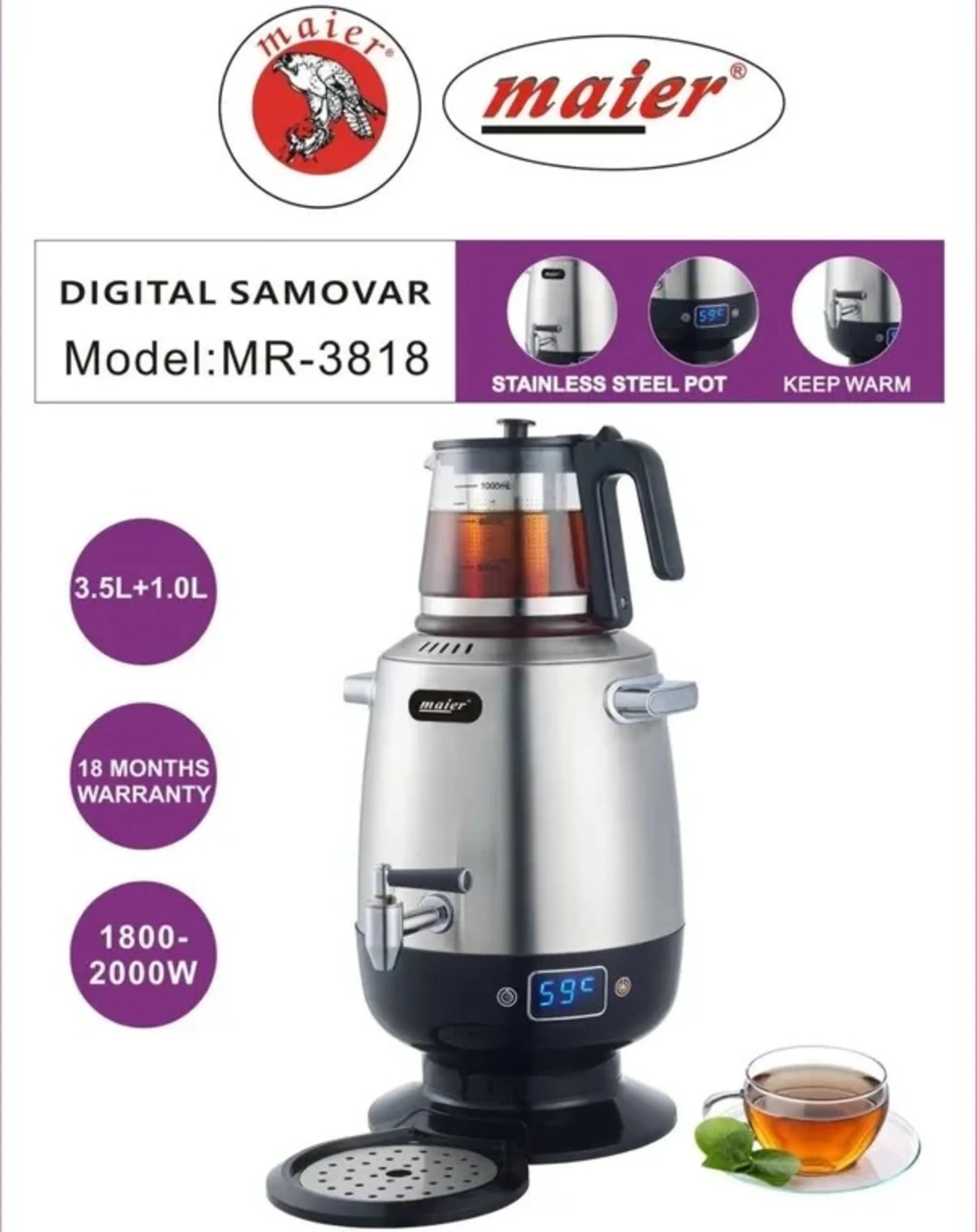 سماور در انواع گازی و برقی وجود دارد. سماور های برقی تنوع بالا و طراحی های مختلف و شکیلی دارند. همچنین در برندهای گوناگونی هم به بازار عرضه شده اند. که ما یکی از زیباترین این مدل یعنی سماور مایر مدل MR-3818 را به شما عزیزان معرفی میکنیم. مایر برند معتبر کشور آلمان است و محصولات گوناگی را هم تا به امروز روانه ی بازار کرده است